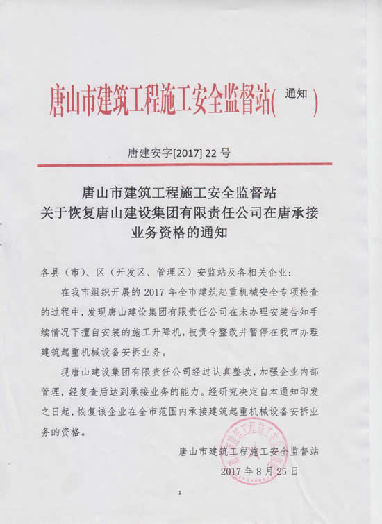 关于恢复唐山建设集团有限责任公司在唐承接业务资格的通知