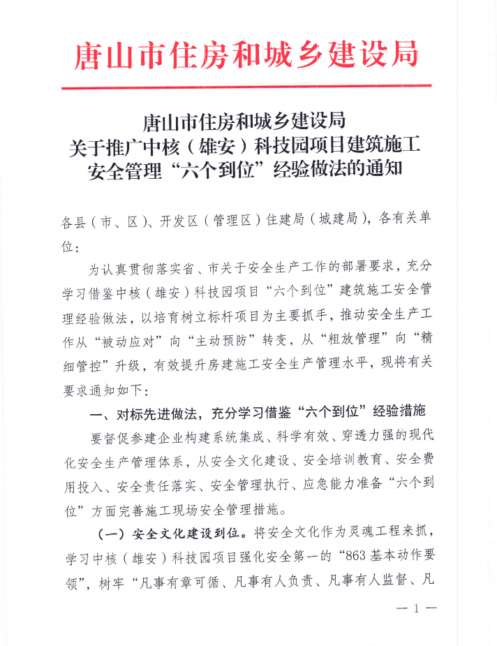 关于推广中核(雄安)科技园项目建筑施工安全管理“六个到位”经验做法的通知